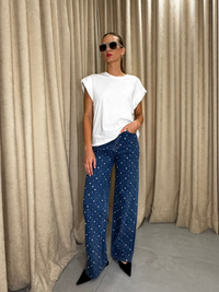 These pearl-embellished jeans offer a refined take on casualwear, blending classic denim with delicate detailing. The subtle pearl accents create an elegant touch that elevates your everyday look while maintaining comfort and versatility. Perfect for dressing up relaxed outfits with a sophisticated edge.
