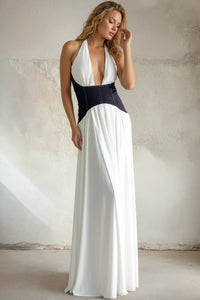Striking denim maxi with a bold contrast halter neckline that commands attention. The structured silhouette flatters the frame while the halter detail adds an unexpected edge to classic denim styling. Perfect for elevated casual occasions or dressed up with statement accessories. The maxi length offers versatility—wear it solo or layer it over basics for seasonal transitions. A wardrobe essential that bridges the gap between timeless and trend-forward.
