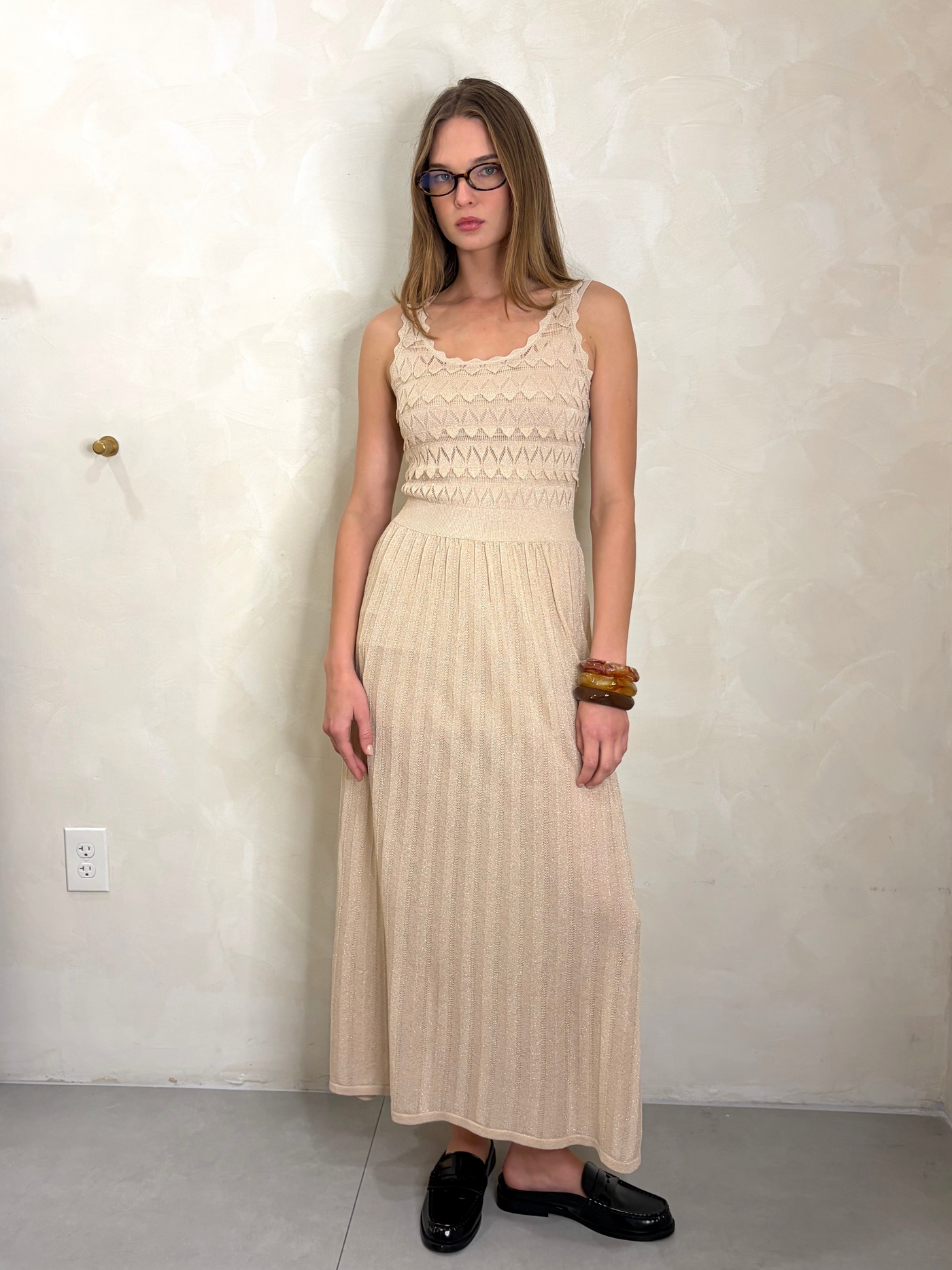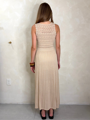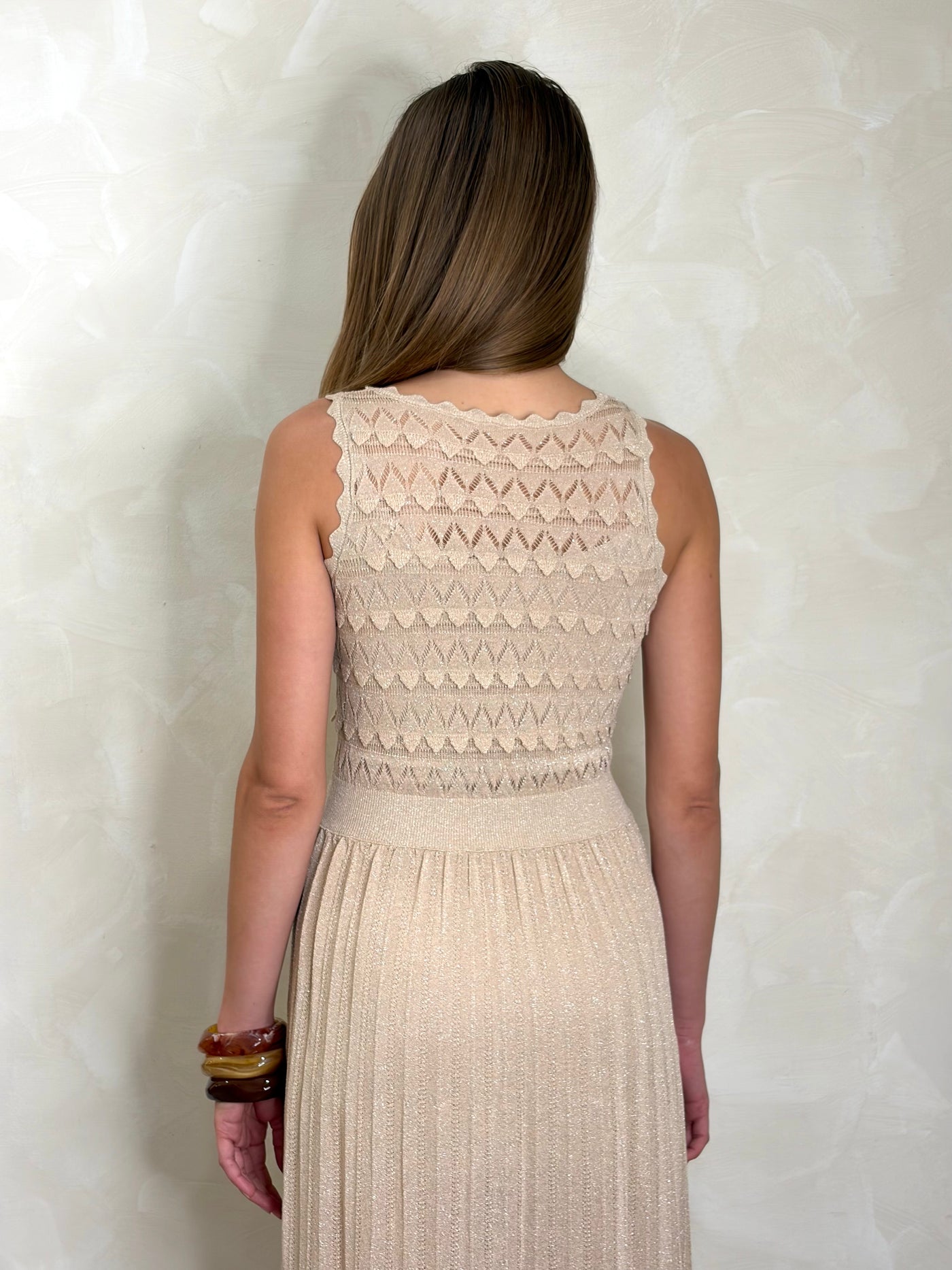 Elevate your evening wardrobe with this sophisticated lurex pleated maxi dress. Shimmering metallic threads woven throughout create an understated glamour, while precise pleating adds refined movement and dimension. The flowing maxi silhouette flatters all figures and transitions seamlessly from special occasions to upscale dinners. A timeless investment piece that captures light beautifully and pairs effortlessly with minimal accessories.