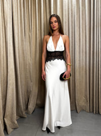 The Lace Insert Maxi Dress showcases intricate lace accents that bring a touch of refined femininity to its flowing design. Crafted for an elegant fit, this dress is ideal for formal occasions, offering a sophisticated silhouette that balances classic charm with modern grace.