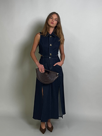 The Multi Button Denim Dress combines classic denim with modern design, featuring a sophisticated multi-button front for adjustable style and fit. This dress offers a polished silhouette that transitions seamlessly from day to evening, blending comfort and elegance effortlessly.