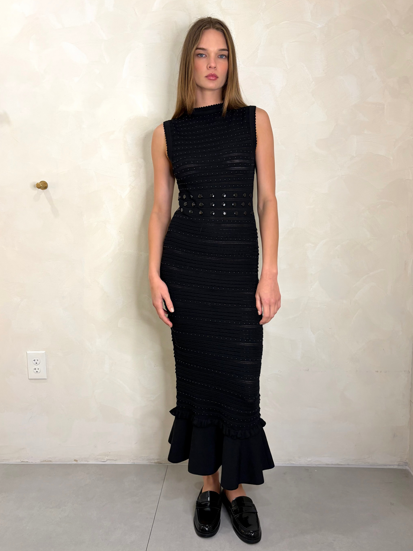 Elevate your evening wardrobe with this striking studded midi dress. Featuring carefully placed metallic studs that catch the light with every movement, this piece balances edgy glamour with refined elegance. The midi silhouette offers versatile styling—dress it up for special occasions or down for confident everyday wear. Premium construction ensures lasting quality, while the sophisticated design makes it a timeless addition to any collection.