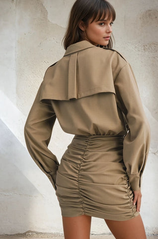 This Utility Mini Dress combines practicality with chic sophistication. Designed for effortless style, it features a flattering silhouette and functional elements such as pockets and durable fabric. Perfect for day-to-night wear, this dress balances modern utility with refined elegance, making it a versatile addition to any wardrobe.