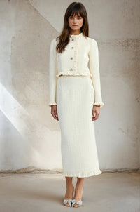 Elevate your wardrobe with the Frill Tweed Midi Skirt, expertly crafted from textured tweed fabric for a timeless, refined look. Its elegant silhouette and subtle frill detailing add a touch of sophistication, making it perfect for both professional settings and stylish outings. Designed to flatter, this midi skirt pairs seamlessly with blouses and heels for a polished ensemble.