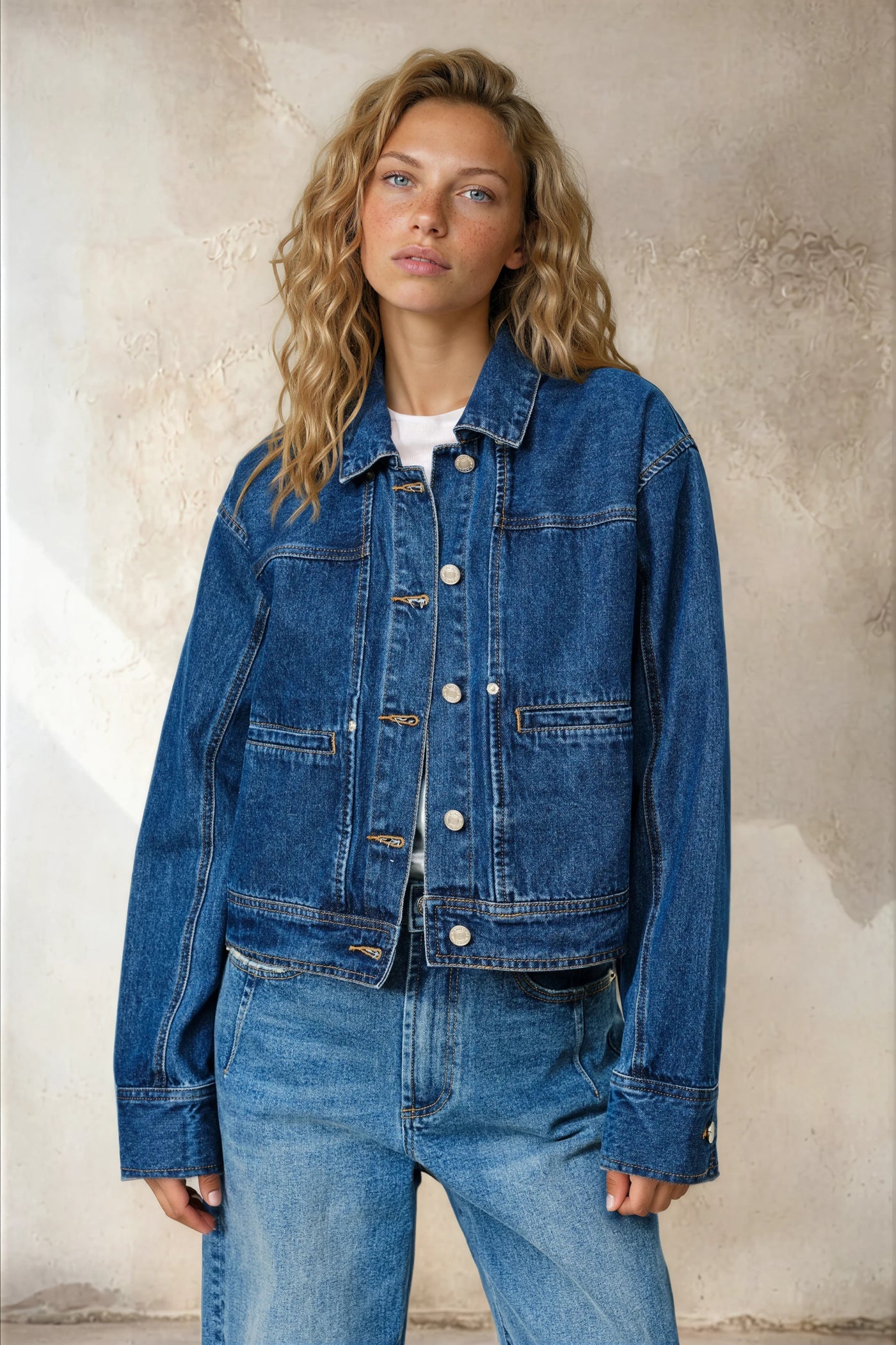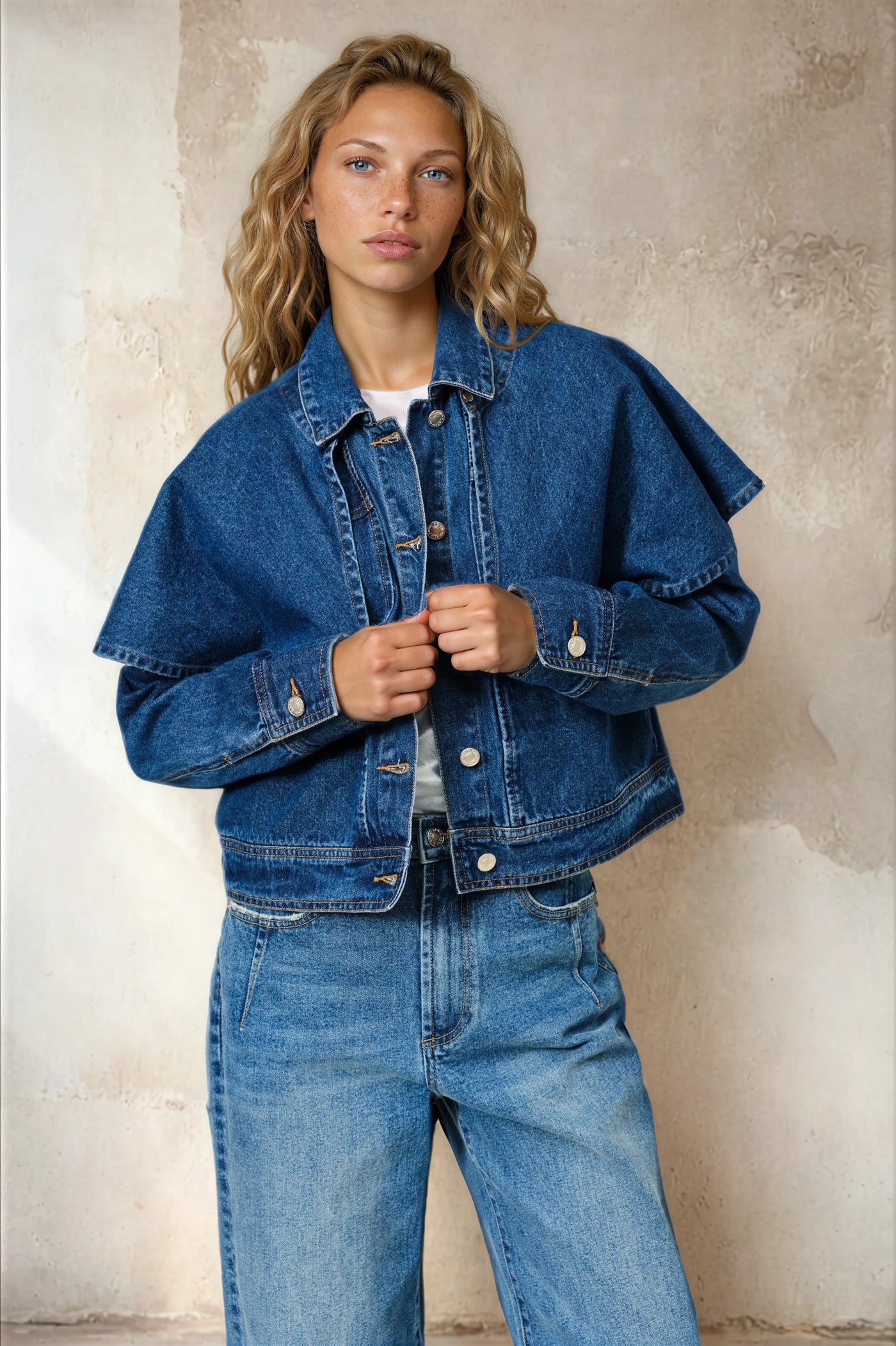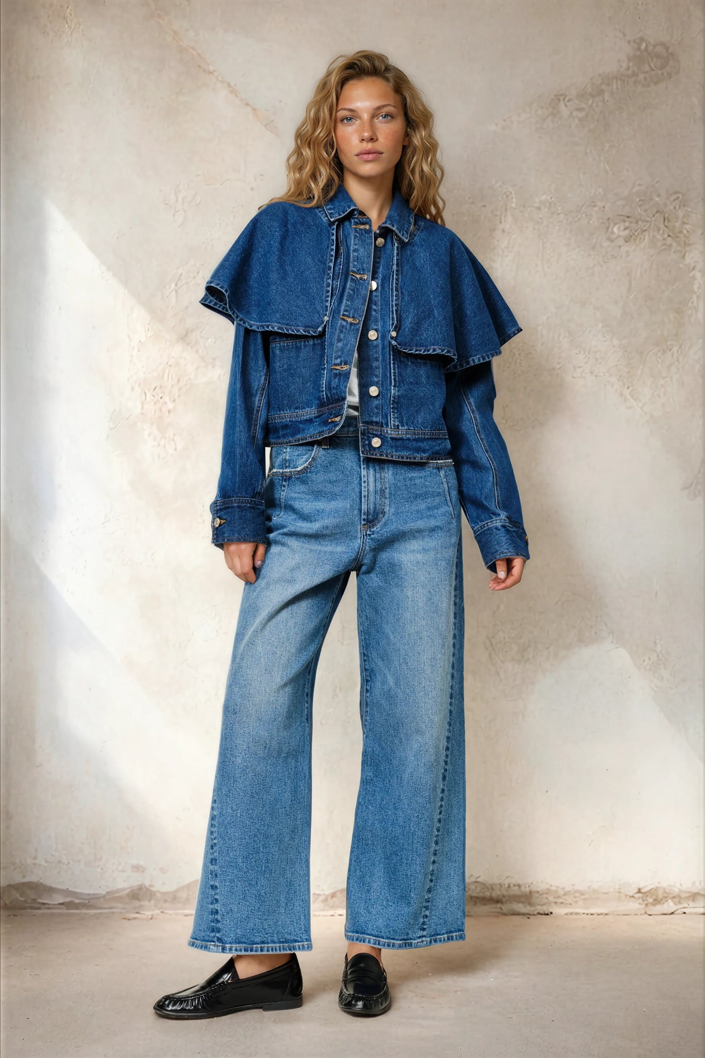 Effortless layering meets statement style with this denim cape jacket. Crafted from classic denim, the dramatic cape silhouette drapes beautifully over dresses, tops, and tees for an instantly polished look. Perfect for transitional seasons, this versatile piece adds texture and dimension to any outfit while maintaining the timeless appeal of denim. A modern take on a wardrobe essential that works from day to night.
