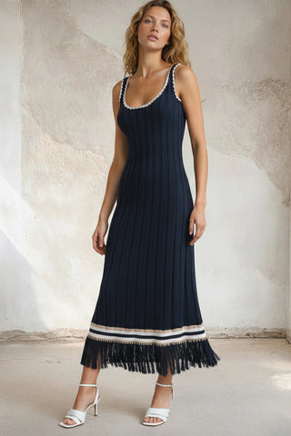 Effortless elegance meets contemporary style in this sleeveless knit maxi. Crafted from a refined knit fabric, the relaxed silhouette drapes beautifully while the fringe detailing adds movement and visual interest. Perfect for layering or wearing solo, this versatile piece transitions seamlessly from day to evening. The maxi length offers timeless appeal, making it an essential addition to any sophisticated wardrobe.