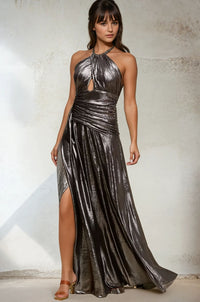 Make a striking entrance in the Metallic Gown with High Slit, where shimmering fabric meets graceful design. This gown features a sleek silhouette complemented by a daring high slit, blending boldness with refined elegance. Perfect for special occasions, it radiates sophistication while allowing effortless movement and a captivating presence.