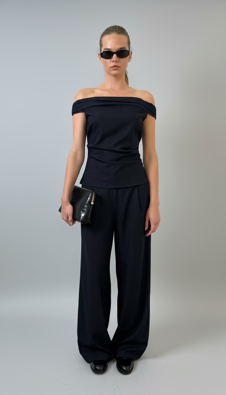 The Pinstripe Asym Top redefines contemporary elegance with its sleek pinstripe pattern and unconventional asymmetric design. Crafted to flatter, this top offers a modern twist on classic tailoring, delivering a polished yet distinctive look. Perfect for elevating both professional and casual outfits, it seamlessly blends structure with subtle edge for a refined wardrobe staple.