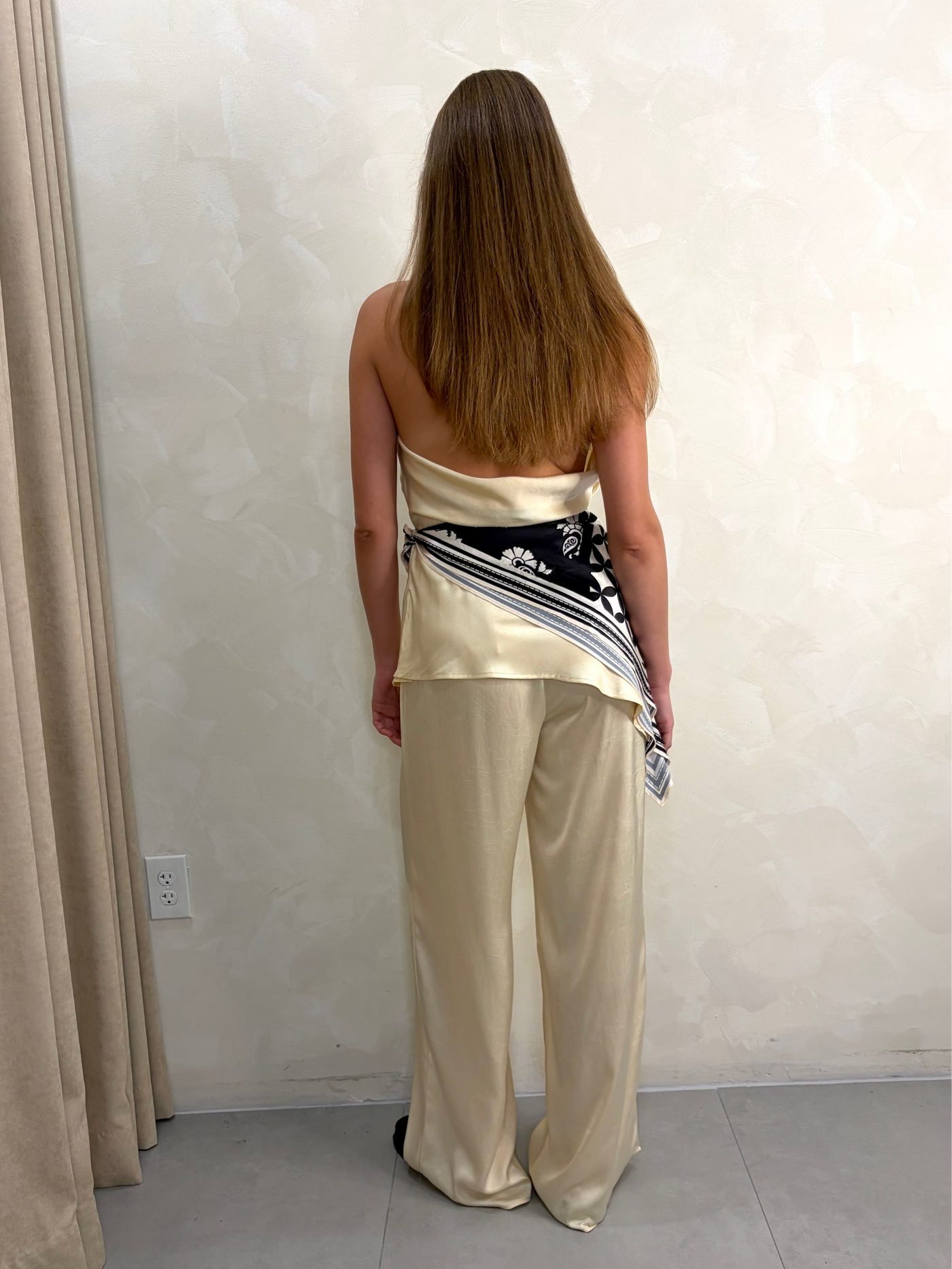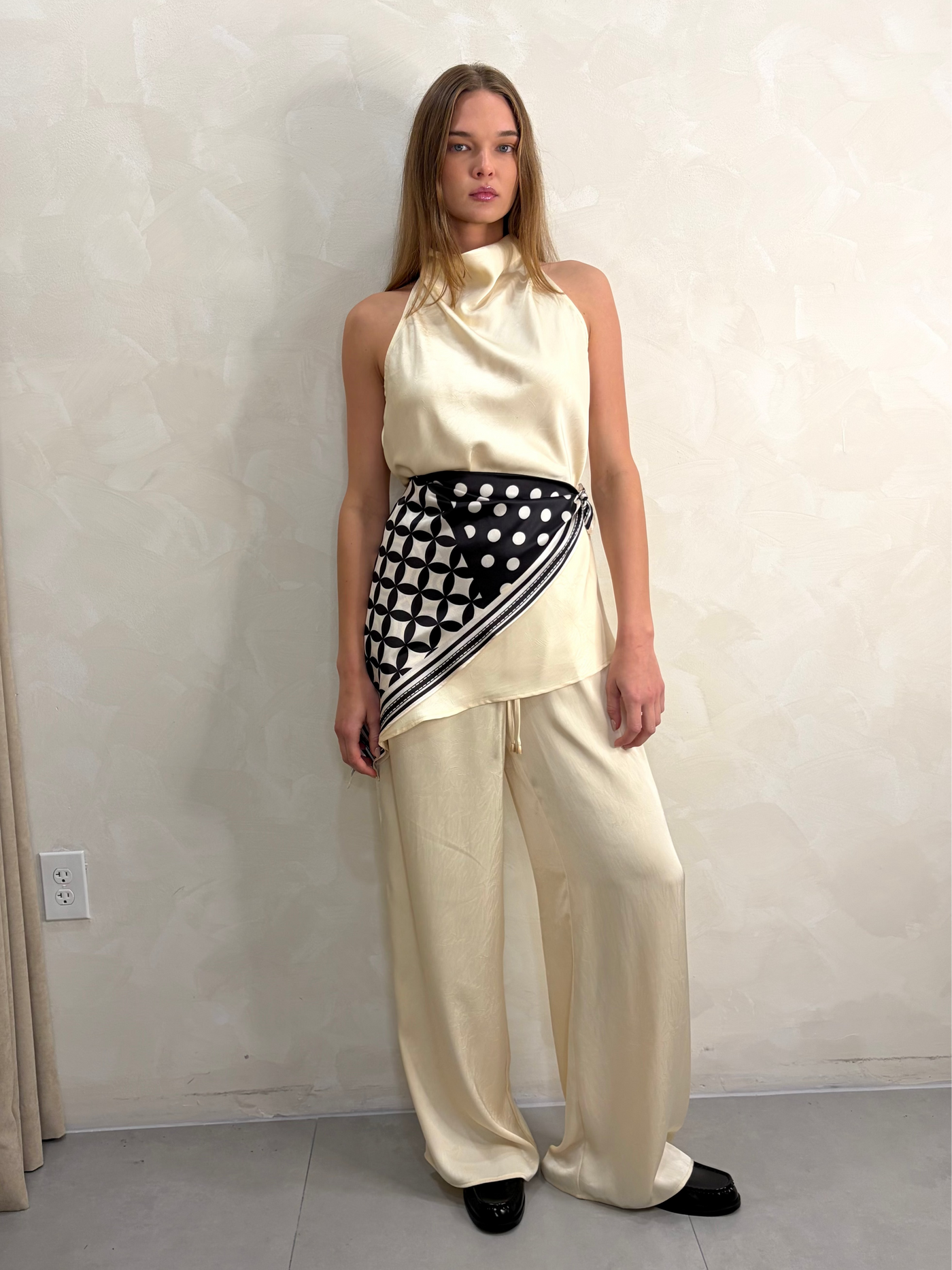 The Drape/Scarf Pant Set showcases refined elegance through its fluid draping and coordinated two-piece design. This set pairs tailored trousers with a draped top featuring scarf-like detailing that adds movement and visual interest to the silhouette. The flowing fabric creates an effortless sophistication while the structured trousers ground the look with polished proportion. Wear the pieces together for a cohesive statement or separate them to extend your styling options throughout your wardrobe. The quality construction ensures lasting wear, making this an investment piece for those who appreciate understated luxury and thoughtful design.